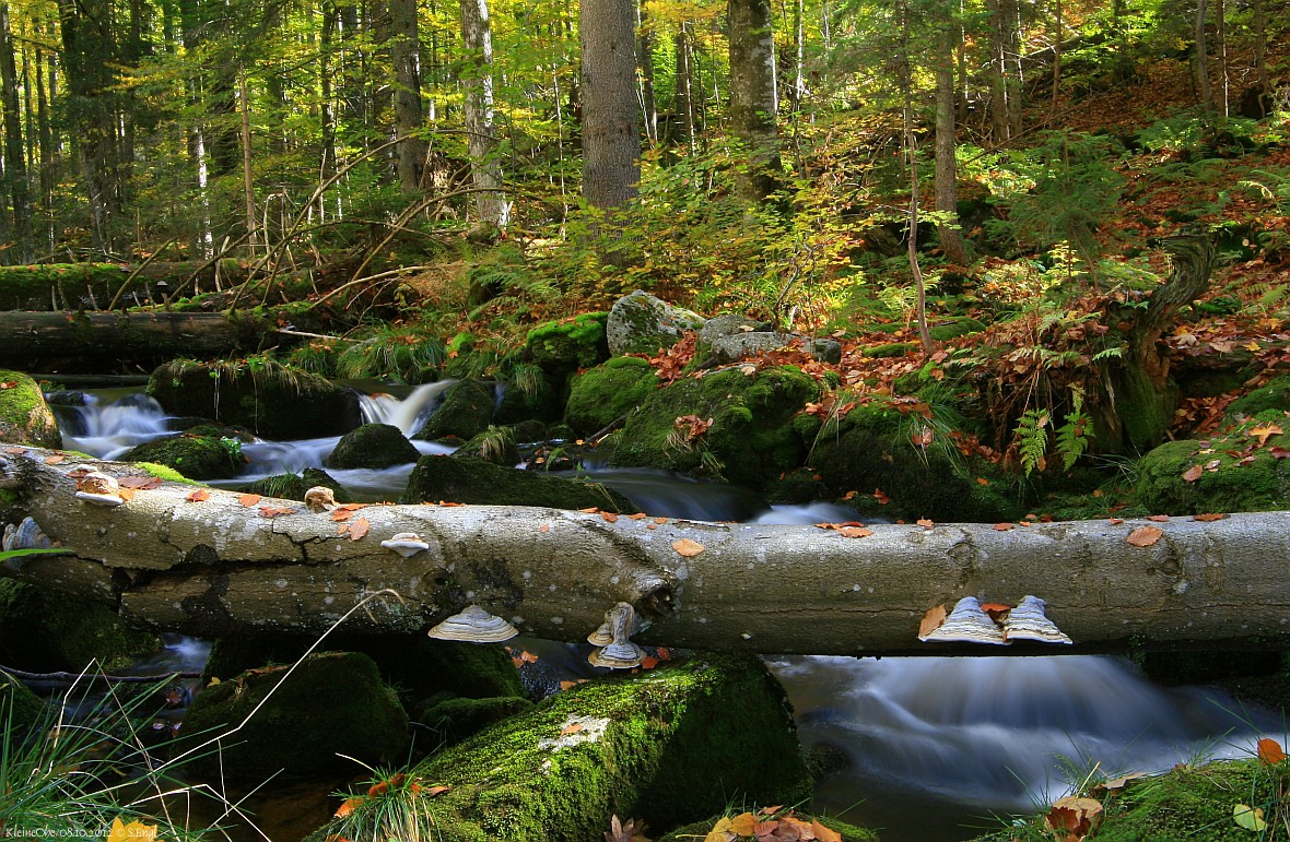 Ein mit "Stockschwammer" (Baumpilze) besetzter Baumstamm über der Kleinen Ohe