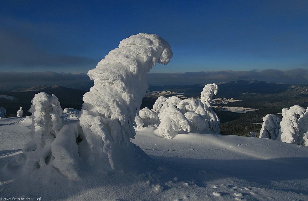 Die Arbermandl (von Schnee und Reif bedeckte Bergfichten) heute Nachmittag