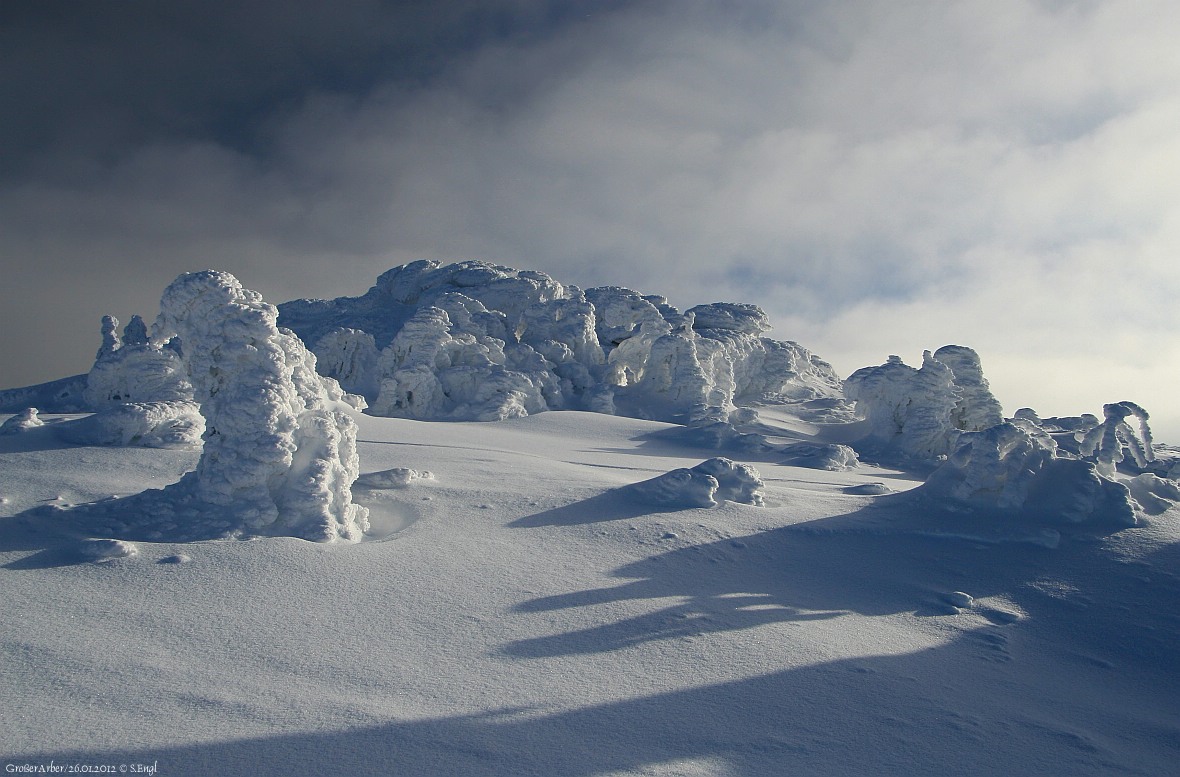 Die Arbermandl (von Schnee und Reif bedeckte Bergfichten) heute Nachmittag