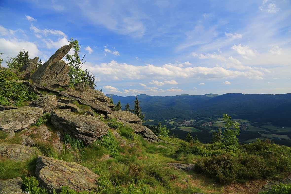 Blick auf die Glimmerschiefer-Felsformationen auf der Osserwiese (1.166m) im Tal ist Lohberg zu sehen