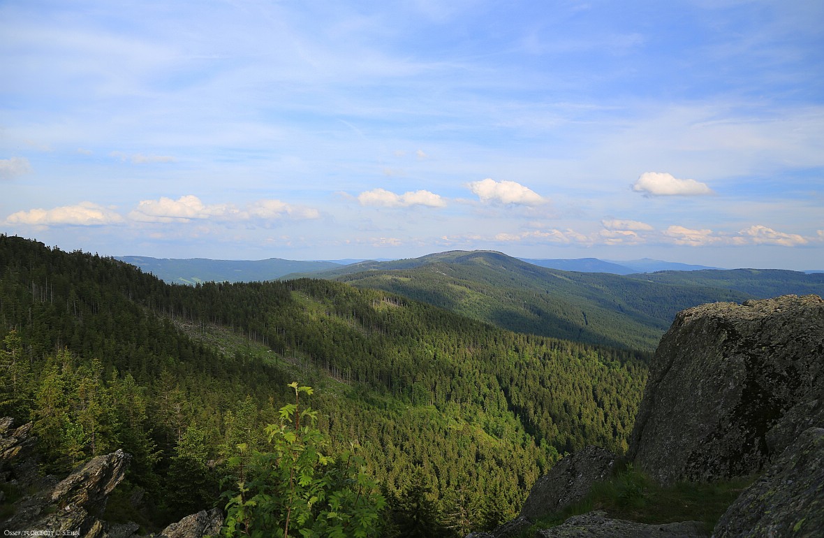 Blick vom Kleinen Osser zum Zwercheck (1.333m), dahinter ist der Falkenstein und Rachel zu erkennen