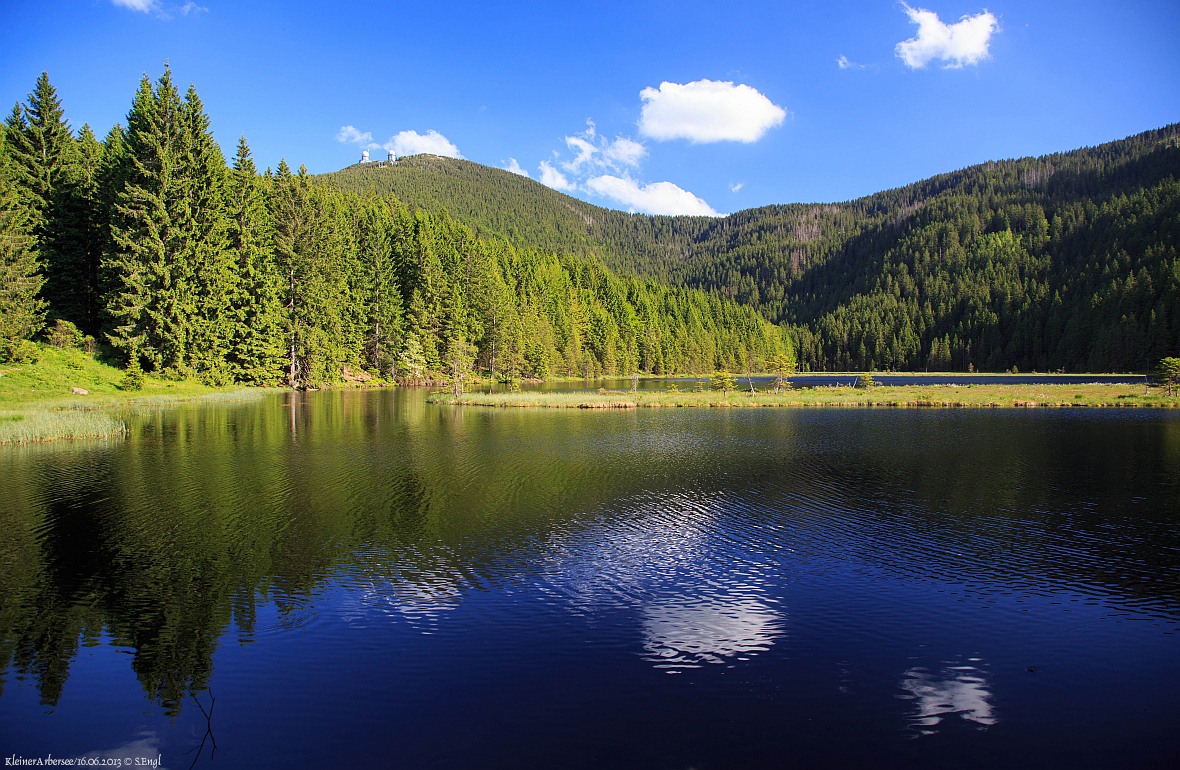 Der Kleine Arbersee (915m) am heutigen Abend mit dem Großen Arber (1.456m) im Hintergrund
