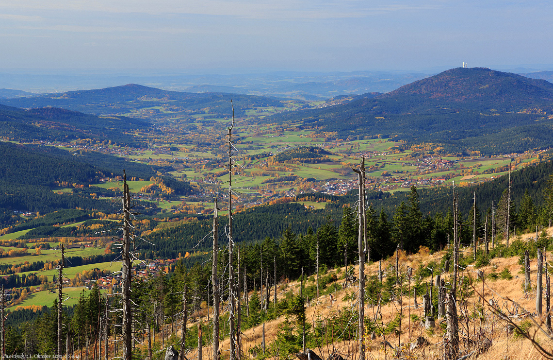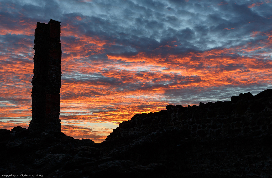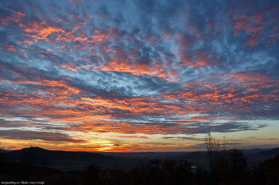 Besonders die sehr gute Sicht in den Lamer Winkel hat mich heute beeindruckt. Fast jedes Haus und jeder herbstlich bunte Baum war im Tal zu erkennen. Am Abend konnte ich dann noch einen sehr farbintensiven Sonnenuntergang auf der Burgruine Runding fotografieren.