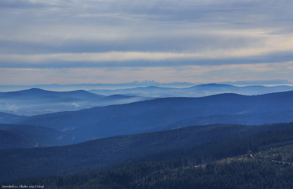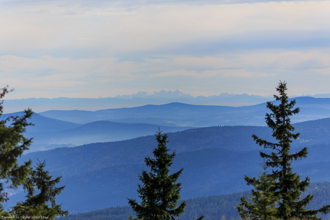 Meine Wanderung begann am Parkplatz Scheiben auf ca. 1.050m. Zuerst ein Stück auf einem Forstweg, ging es dann steil bergauf Richtung Kamm des Kühnischen Gebirge. Oben angekommen, wanderte ich weiter auf einem kleinen Pfad der Grenze entlang, bis ich schließlich den Gipfel des Zwercheck auf 1.333m erreichte. Von hier aus hat man eine beeindruckende Aussicht nach Süden zum Lusen, Falkenstein, Rachel und - wenn die Bedingungen wie heute passen - sogar bis zu den Alpen. Im Westen sieht man den Höhenzug zwischen Arber und Kaitersberg. Richtung Norden den Lamer Winkel und Hohen Bogen.